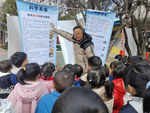 学院6个支部的教师党员和学生党员代表分别进入大班和中班教室,通过卡通PPT、动画视频、现场互动等形式,用童言童语讲述“如何与宠物安全拥抱”“被小猫咪抓伤后该怎么办”“宠物疫苗的小秘密”等知识。临床兽医教工党支部书记李小兵老师则在幼儿园操场上为小班和小幼班的小朋友们开展了别开生面的现场教学。