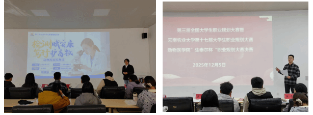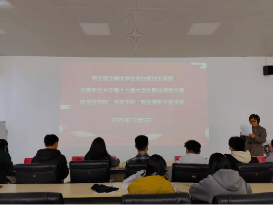 为深入贯彻落实学校关于大学生就业创业工作的部署,切实增强学生职业生涯规划意识与就业竞争力,学院积极响应号召,于2025年12月5日下午在新楼209成功举办动物医学院第三届大学生职业规划大赛暨云南农业大学第十七届大学生职业规划大赛(动物医学院“生泰尔杯”)院级决赛。